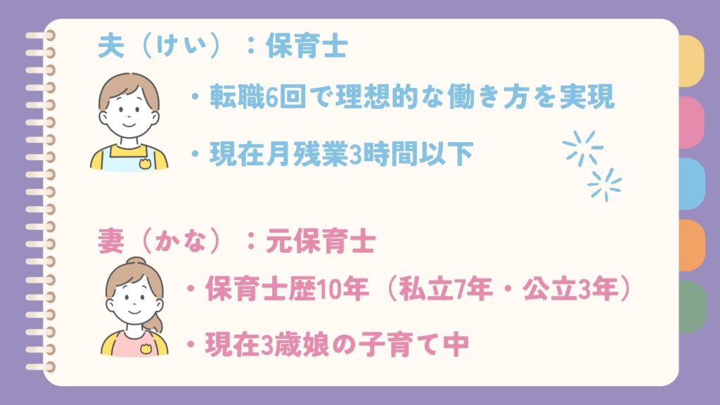 • 夫(けい):保育士、転職6回で理想的な働き方を実現、現在月残業3時間以下