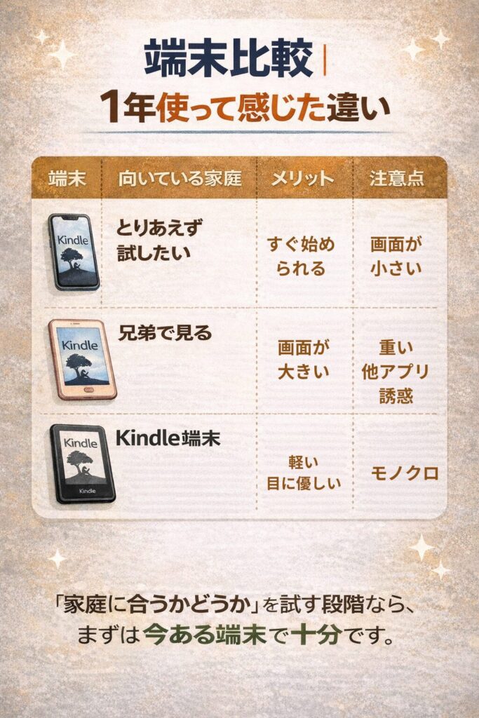 | Kindle端末 | 読み聞かせ中心 | 軽い・目に優しい | モノクロ |